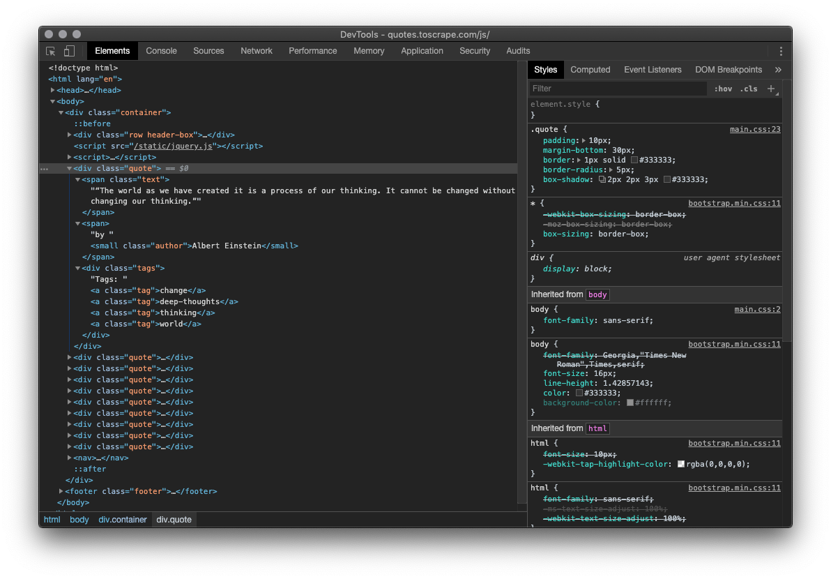 - devtools elements view of toscrape javascript example site