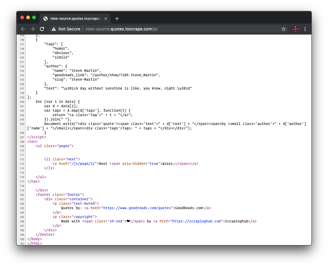 - view source view of toscrape javascript example site