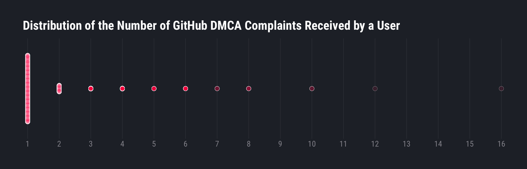 title = "Distribution of the Number of GitHub DMCA Complaints Received by a User"
