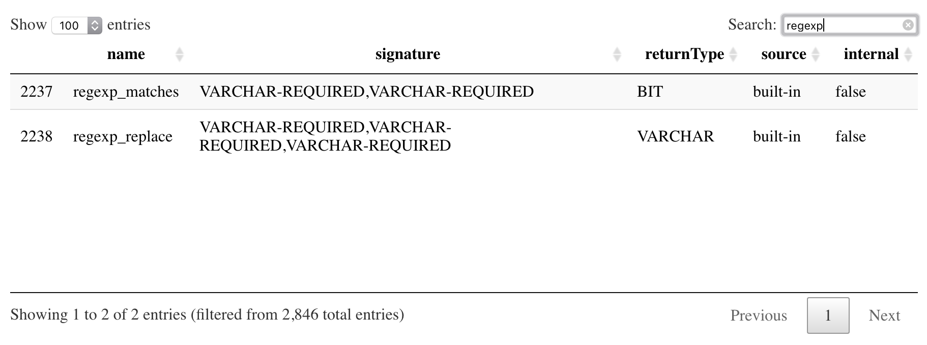 The Drill system options table now has full descriptions for the options and also provides a new table that knows about all of Drills functions and all your custom UDFs. drill_opts() and drill_functions() return a data frame of all this info and have an optional browse parameter which, if set to TRUE, will show a DT interactive data table for them. I find this especially handy when I forget something like regexp_like syntax (I use alot of back-ends and many are wildly different) and can now do this: